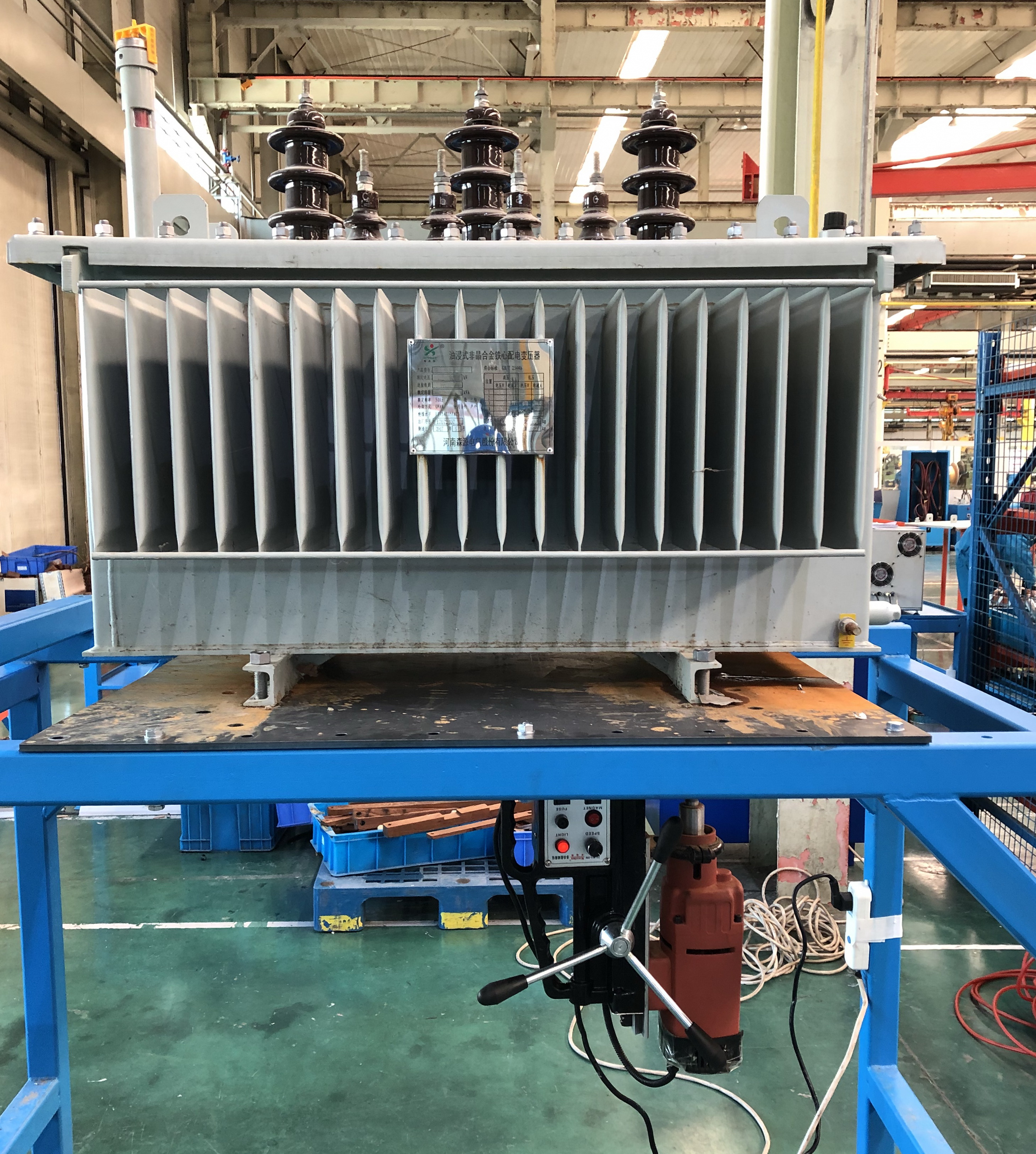 ????? 以前,當用戶要求的變壓器地腳孔距與備庫非晶合金變壓器不一致時,需要經(jīng)過抽油-吊芯-拆附件后才能進行鉆孔,之后還要進行重新裝配-注油—抽真空-靜止與試驗等一系列工序,改裝過程極其繁瑣,不僅浪費大量人力,還影響產(chǎn)品交貨期。針對此問題成裝車間主任帶領車間骨干員工集思廣益、群策群力設計地腳孔拆改專用工裝。該工裝分為支撐架與支撐鋼板兩部分,在支撐鋼板上可實現(xiàn)后續(xù)所有非晶變壓器地腳孔的便捷調(diào)整,人站立在支撐架下面使用磁力鉆即能進行精確的測量與孔距調(diào)整,避免了對整個變壓器器身的拆改裝配,在降低了員工勞動強度與工作量的同時,還縮短了產(chǎn)品交貨期。